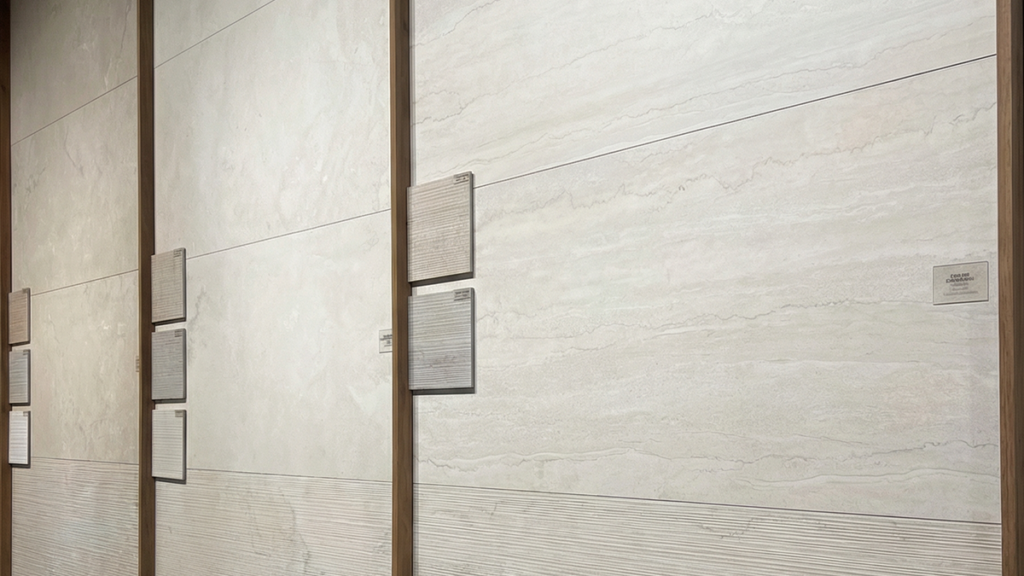 Uno de los aspectos que más interés generó fue la incorporación de relieves en distintas colecciones, como Crown, Namibia, Constanza, Coralstone, Dorset y Portlandstone. Con estas propuestas buscamos aportar textura y dinamismo, permitiendo trabajar los revestimientos desde una perspectiva más arquitectónica y sensorial.