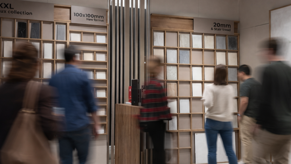 También mostramos la versatilidad de nuestras soluciones a través de una amplia variedad de formatos y espesores. Las piezas de 20 mm evidenciaron su potencial para exteriores y zonas de alto tránsito, mientras que el formato 100×100 cm ofreció un equilibrio entre modularidad y continuidad visual. Por su parte, las placas de gran formato de 120×280 cm reforzaron nuestra apuesta por espacios más continuos, con menor presencia de juntas y una mayor sensación de amplitud.